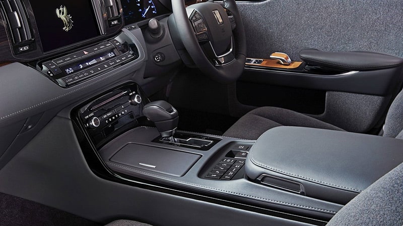 Its sumptuous rear seat area indulges VIPs with exquisite craftsmanship, power seat adjustment, power seat massages, power leg rests and generous space made larger by slightly increased overall body dimensions. An LCD panel also provides fingertip command of the seats, audio system and climate control.