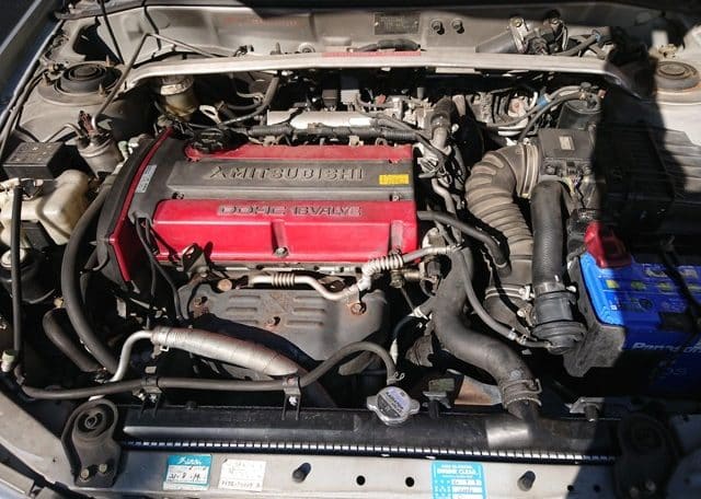 Let’s start with the engine: We’ve got a two-liter, straight four cylinder unit: Mitsubishi’s 4G63, a power plant with years of rally successes behind it. It’s an iron block engine that is very solid and can handle high boost pressures; this helps to make the engine fundamentally more reliable, especially in stock form. The aluminum cylinder head has dual overhead cams (DOHC) and had four valves per cylinder; the classic highly-tuned engine format. The 4G63 also has multi-point fuel injection, of course.