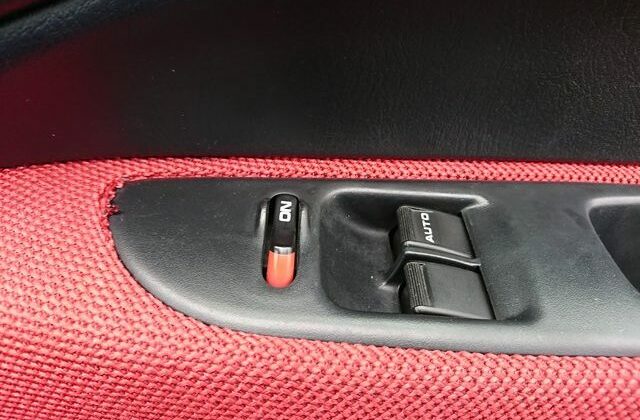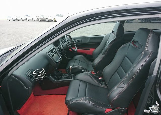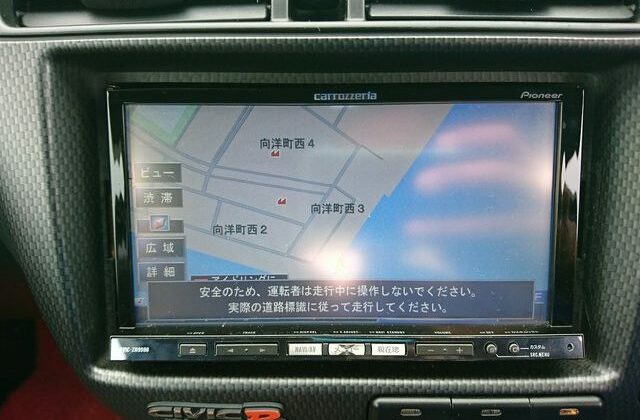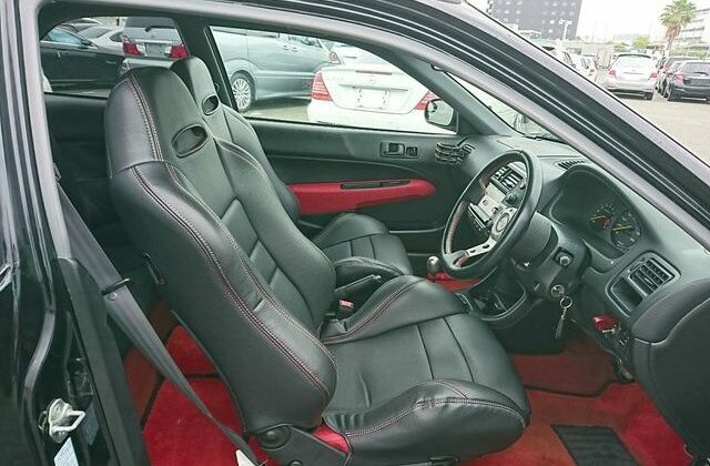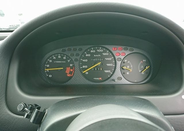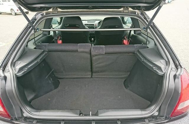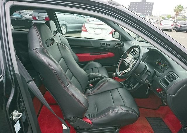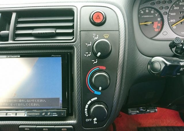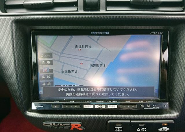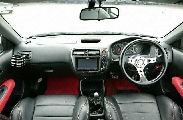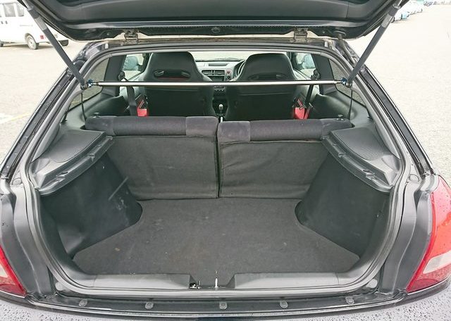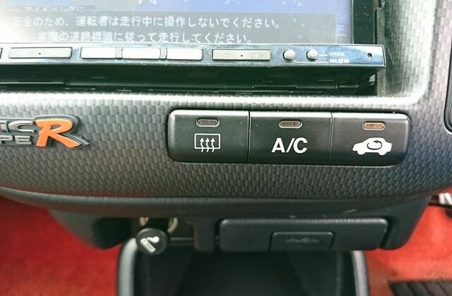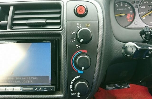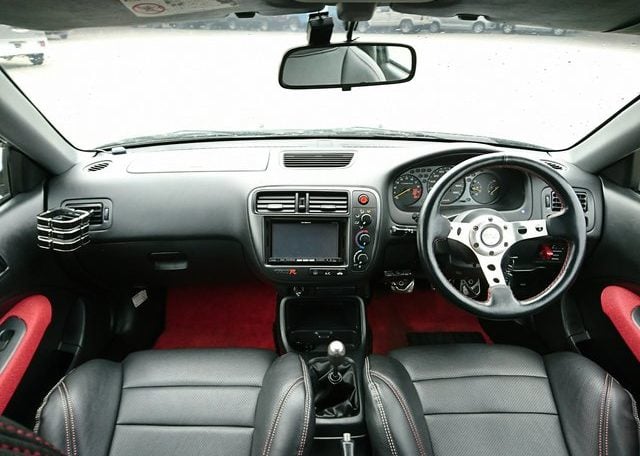 Step inside and you’ll discover more room than you imagined, courtesy of efficient Honda packaging including a transversely mounted engine. This beautiful model currently possessed by Japan Car Direct has a black interior with standard Type R features like red floor mats and armrests, a titanium shift knob, carbon fiber style meter backing, sporty aluminum pedals and of course “Type R” monikers here and there. The standard Momo leather-wrapped SRS steering wheel has been replaced by something sportier. And black leather bucket seats with red stitching replace the standard red fabric sport seats. Rear storage space is generous and convenient amenities like air conditioning and a navigation system are included. To make our customer even happier the owner included the original white Type R alloy wheels at no extra cost!