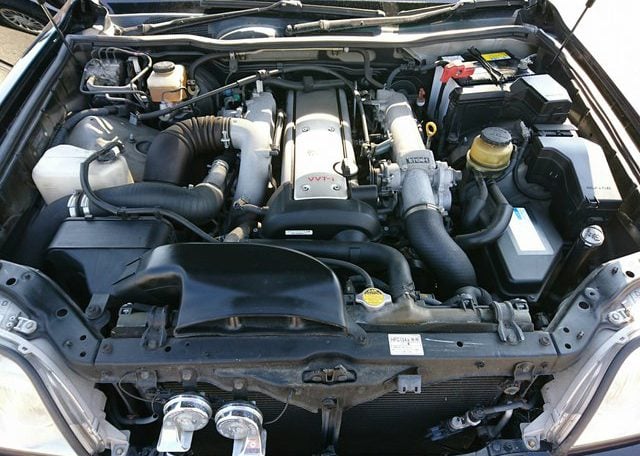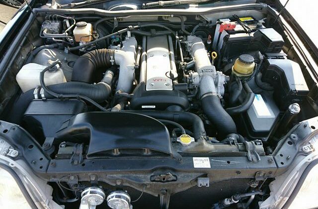 The 2.5-liter inline 6 DOHC turbo engine (1JZ-GTE) in the 2001 Toyota Crown Athlete V delivers more torque at low engine speeds than other contemporary Crown engines because smaller exhaust ports accelerate the flow of escaping gasses and turn the single, more efficient turbocharger faster at low rpm. The 24-valve engine is also equipped with continuously variable valve timing (VVT-i) that squeezes out more efficiency.