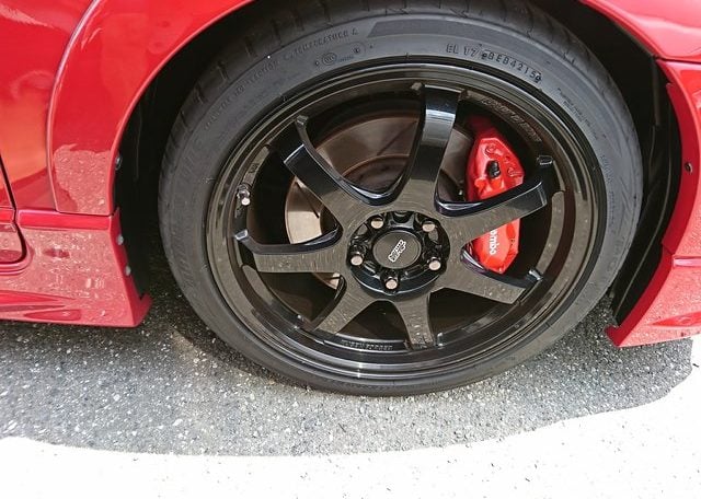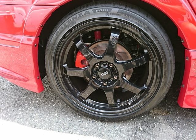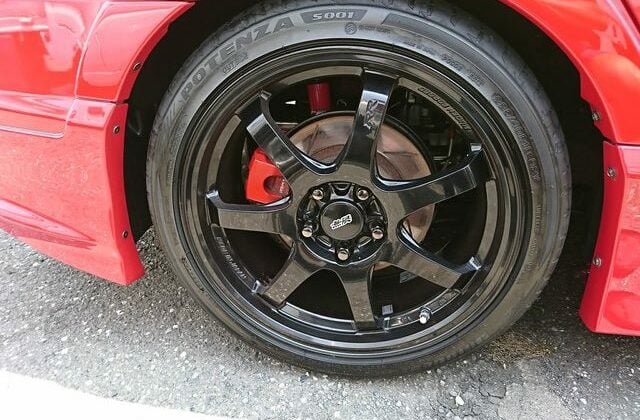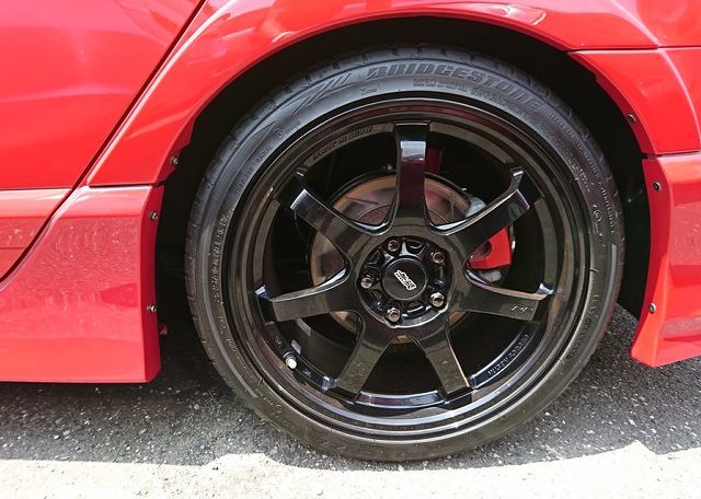 Handling is sharper with more predictable, higher precision steering, more solid stability, a firmer ride and fantastic grip that keeps you in control when pushing it around corners. In fact, the ability to enter corners at higher speeds is this model’s main advantage over the stock Civic Type R. Mugen’s suspension features stiffer springs and five-way adjustable dampers that can be manually adjusted with a special tool kept in the tool box beneath the trunk room floor. Wider 18-inch Mugen 7-spoke aluminum wheels are fitted with sticky Bridgestone Potenza RE070 225/40R18 tires and the stock Civic Type-R Brembo calipers feature lightweight slotted Mugen rotors for controlled, predictable deceleration that is truly top class. Carbon air ducts help keep the front brakes cool even during spirited driving.