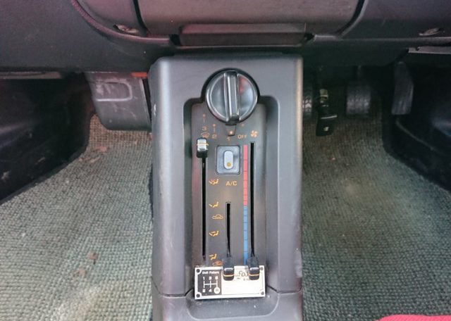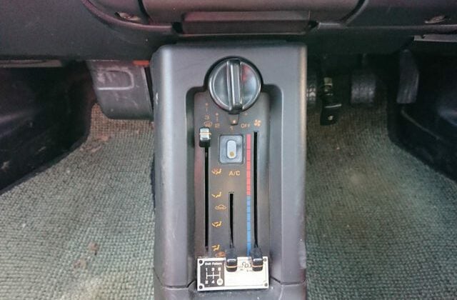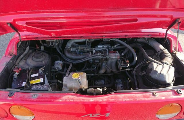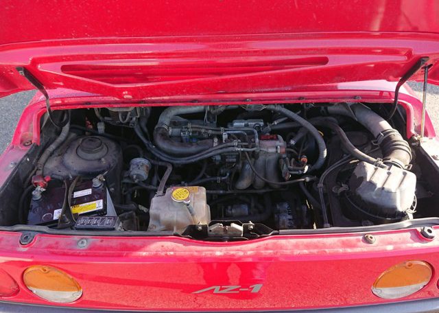 The engine is the tried and true Suzuki F6A. My experience with this engine has been very positive and, while I have not yet driven an AZ-1, I have driven the Suzuki Cappuccino and the Suzuki Alto Works Kei sports cars that use this same engine and transmission gearing. In stock Kei sports trim there are two versions of the F6A turbo-charged, inter-cooled, straight three cylinder power plant: the 2-valve SOHC head and the 4-valve DOHC head. The 2-valver, like what you’ll find in an early ‘90s Alto Works i.e. puts out 9.2kg/m of torque at a nice low 3,500rpm, and 61ps of horse power at 6,000rpm. The 4-valver, like what you’ll find in an Alto Works RS/X or in this Mazda AZ-1, puts out 8.7kg/m of torque at a higher 4,000rpm and 64ps (officially) of horse power at 6,500rpm. (This 4-valve engine redlines at a stratospheric 9,000rpm!)