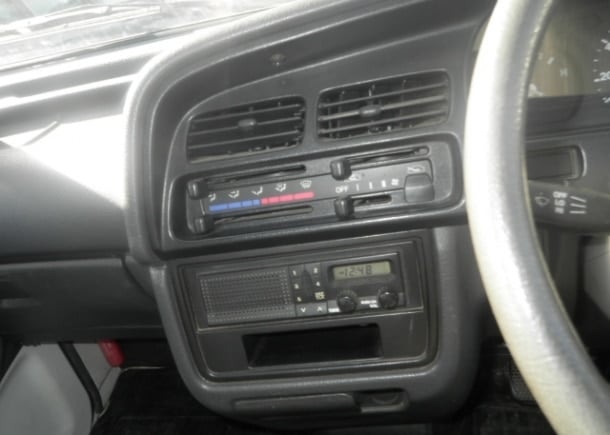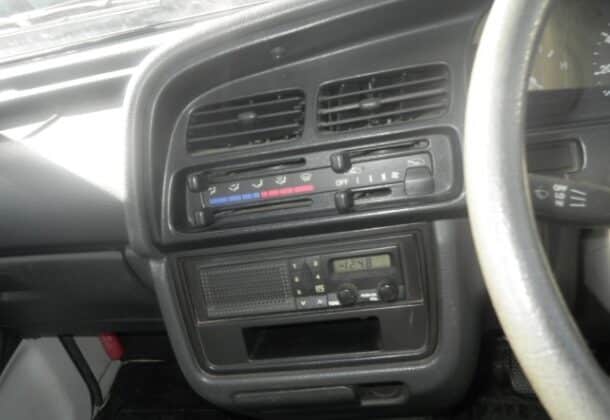 Rectangular headlights, rather than round ones, tell you this clean white 1995 Suzuki Carry is one of the higher spec models. Its clear front turn signals further convey that it was released before July 1995 when Suzuki started making them fully amber.