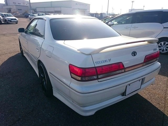 The first one that I’ve got to tell you about is the Toyota Mark-II. We just exported this very handsome, very tough-looking (and truly tough, in fact, since these JZX-100 chassis Toyotas are among the strongest-built cars in the drift car class), white Mark-II Tourer-V to the UK.
