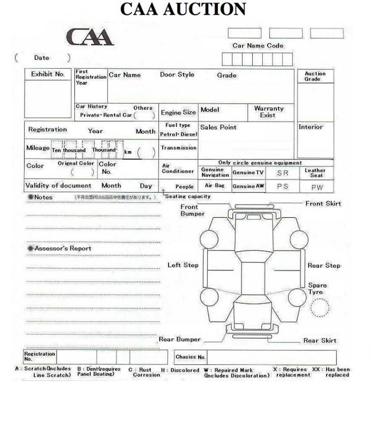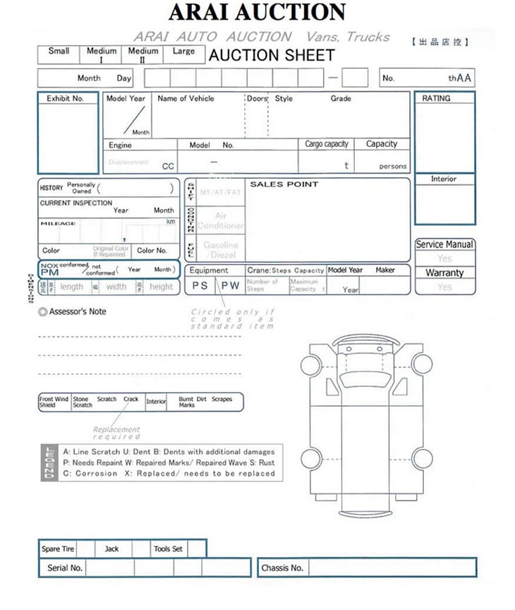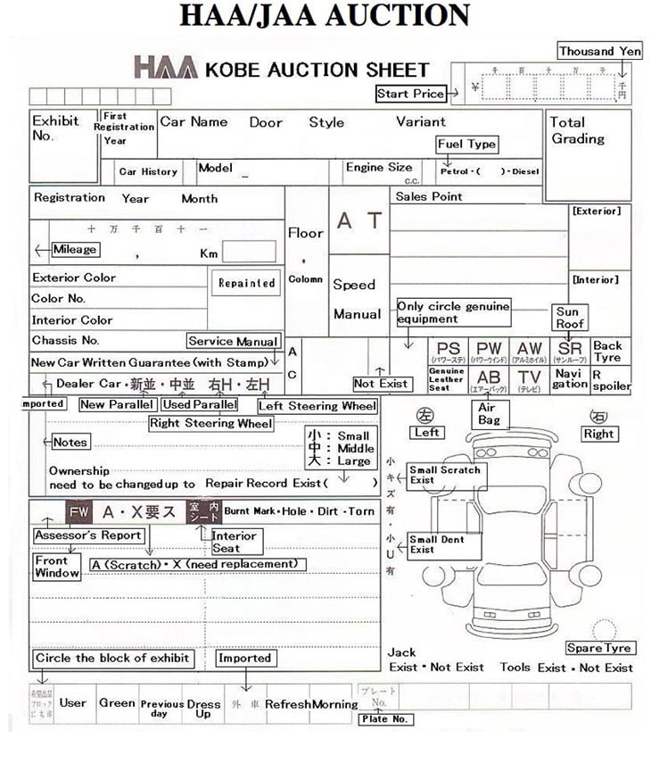 The auction sheet below is an example from the USS auction network. Most of the auctions use slightly different sheets. Please contact us for a detailed explanation and translation of each particular report that you are interested in.