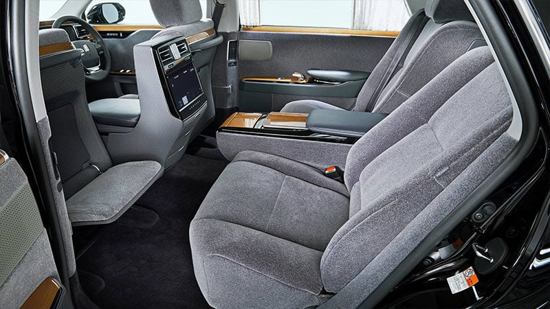 Its sumptuous rear seat area indulges VIPs with exquisite craftsmanship, power seat adjustment, power seat massages, power leg rests and generous space made larger by slightly increased overall body dimensions. An LCD panel also provides fingertip command of the seats, audio system and climate control.
