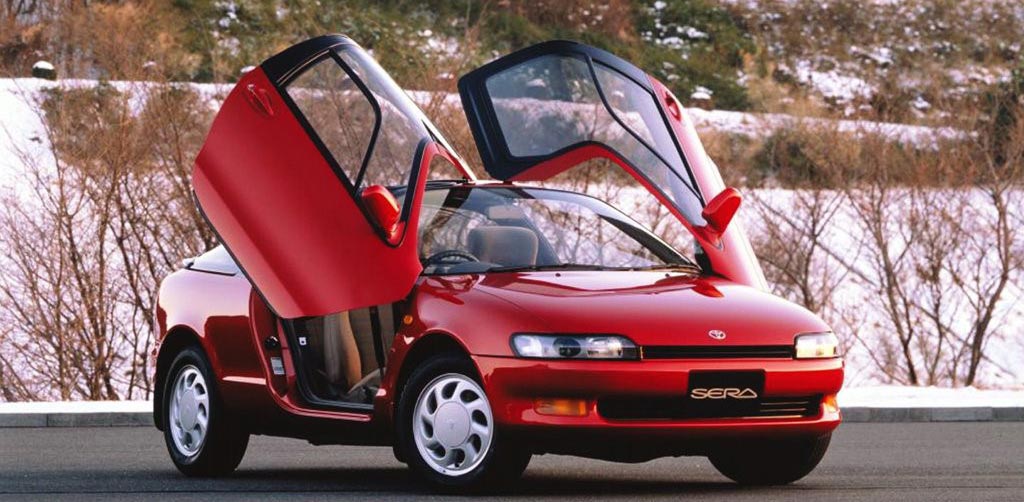 The Toyota Sera stands out with its mostly glass roof and butterfly doors (the same type of doors featured on McLarens). Otherwise, it’s a pretty standard three-door hatchback of standard size and power offering the dependability, high quality and performance you’d expect from Toyota. Imagine the stares and comments when you park at your local supermarket and open those doors!
