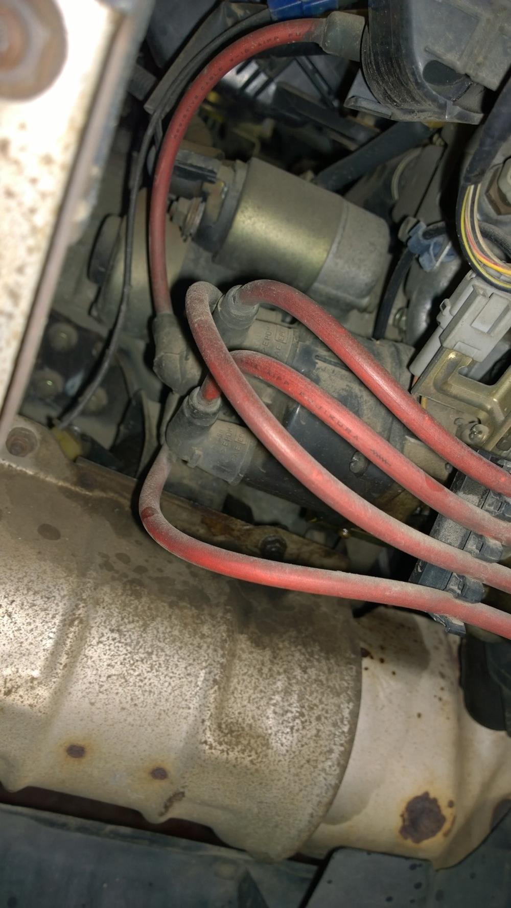 Remove the spark plug wires and the coil-distributor wire, taking note of which wires go to which spot as they will need to go back in the same order. BTW, the reason the bolts look “wet” is because they were sprayed with a penetrating oil before to help with disassembly [Image 4].