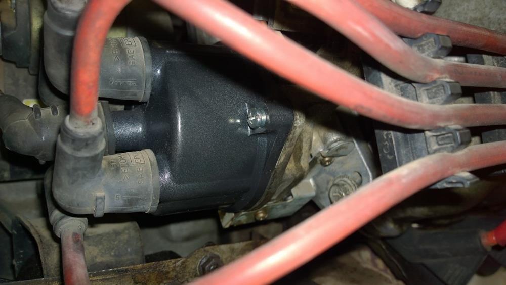 Wipe down the base of the distributor and clean the matching area on the engine side. Slightly grease or oil the new oil rings, and replace. Replace the rotor and screw in the new distributor cap. Adjust the tang to match the groove and slide the distributor back into its original position. Making sure to line up the marks on the housing and base (or use a timing gun to adjust position), tighten the two bolts at the base of the distributor, clip in the wiring harness and replace the spark plug wires in the original position.